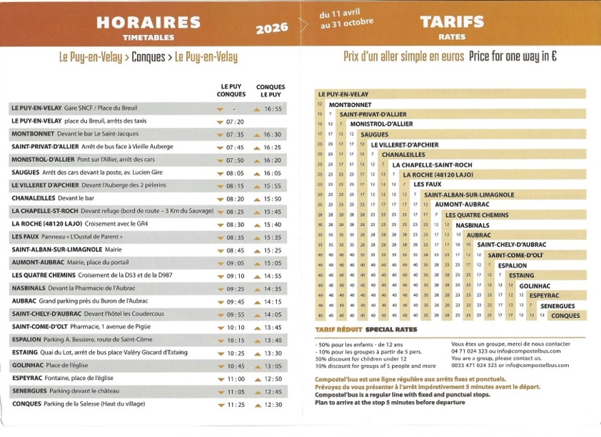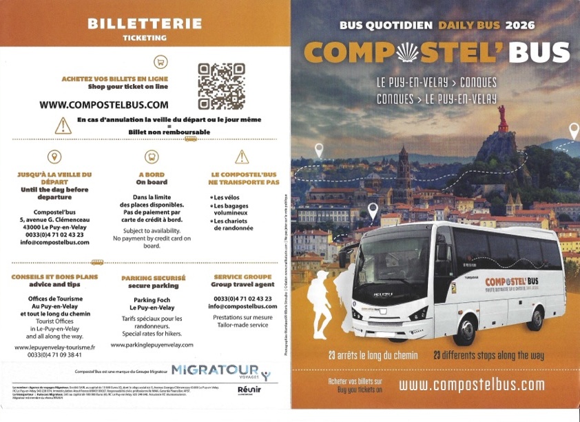 La ligne de bus quotidienne le long du chemin de Compostelle et retour Conques - Le Puy. Prenez le bus en marche et composez votre chemin de Saint Jacques de Compostelle